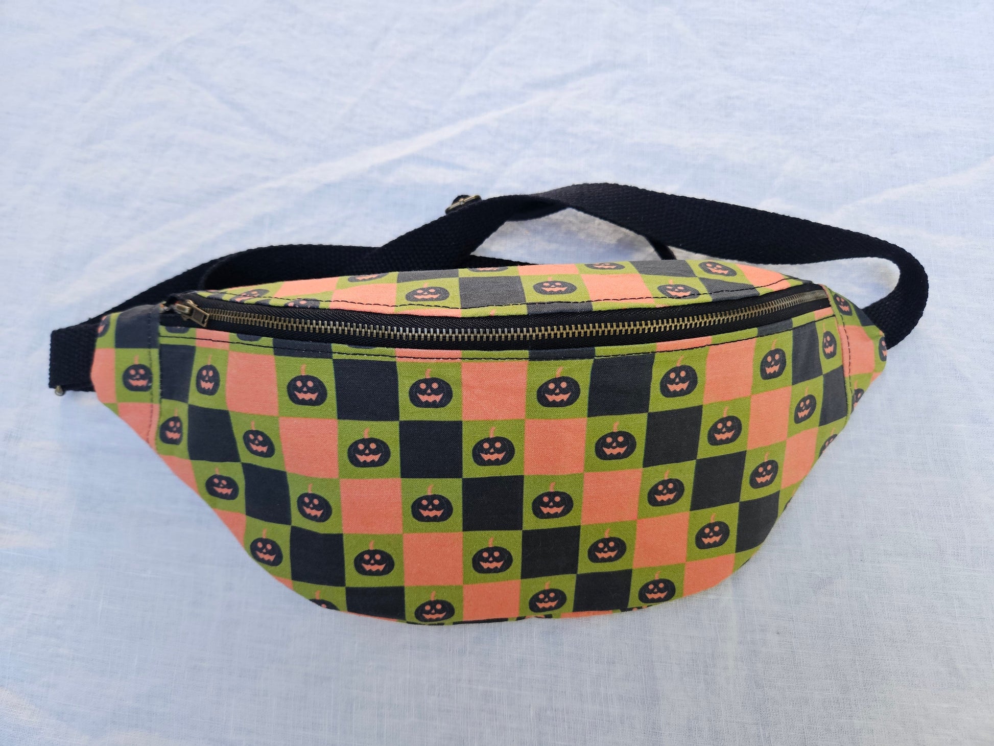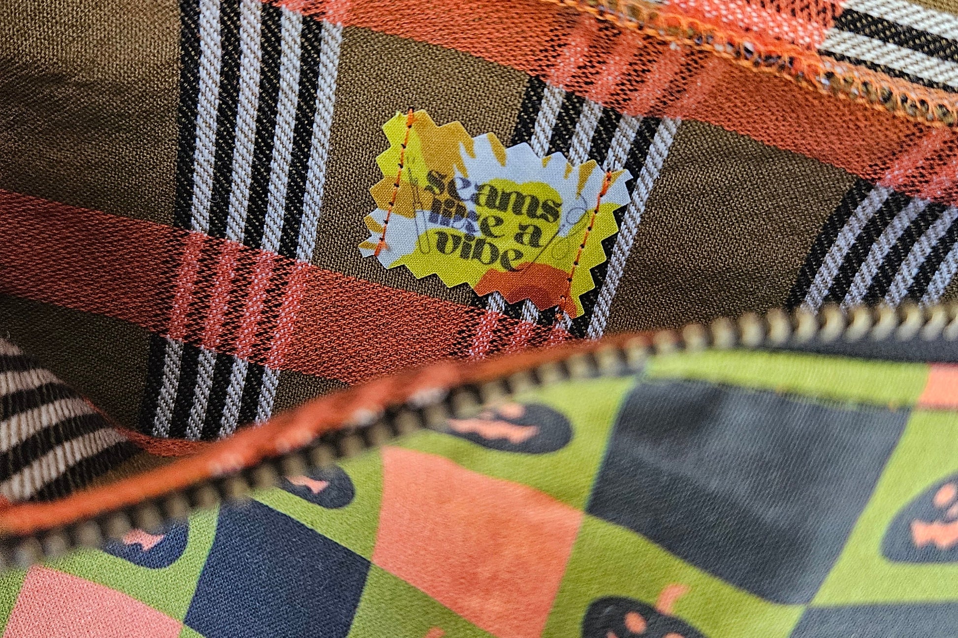 Checkered pumpkin fabric exterior, Autumn plaid interior--both fabrics 100% cotton, though there is interfacing ironed to the fabric to give it more structure/shape.
