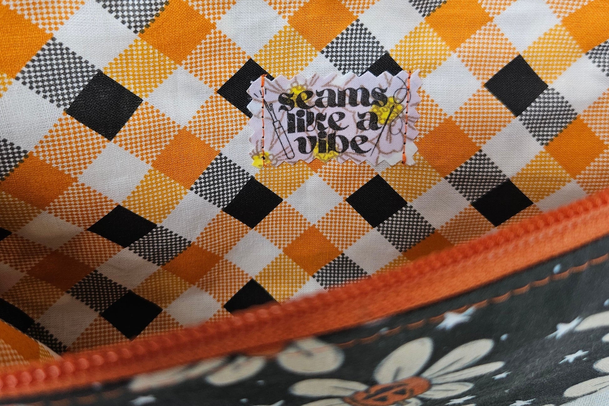 Cute daisy pumpkin print exterior and a Halloween colored plaid/gingham interior--both fabrics are cotton, with interfacing added to help the bag keep it's shape and not be as floppy.