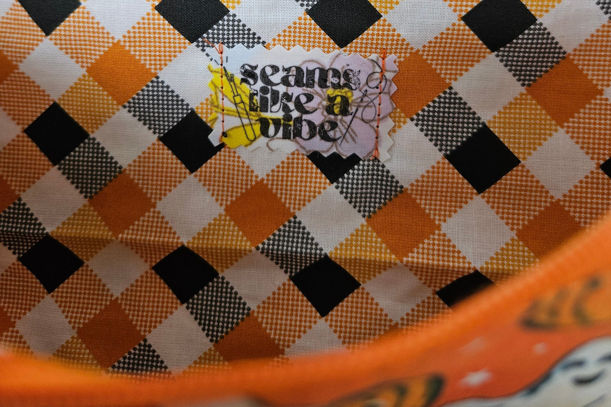Vintage-inspired Halloween print outside and a Halloween plaid/gingham interior. Both fabrics are cotton, with interfacing added to help the bag keep it's shape and not be as floppy.